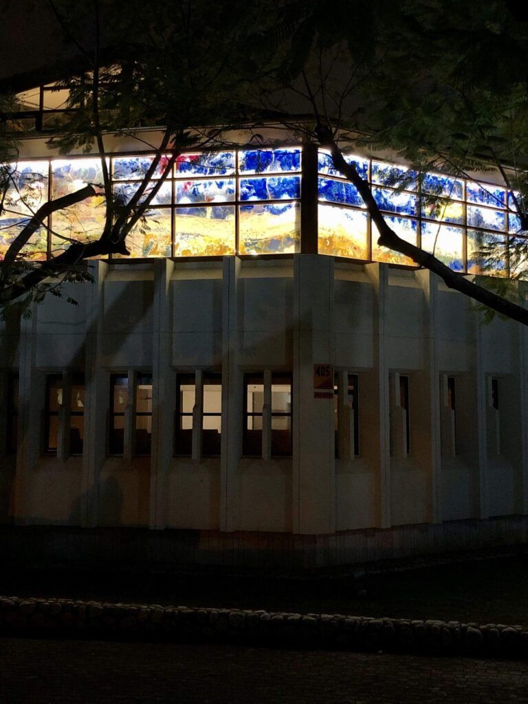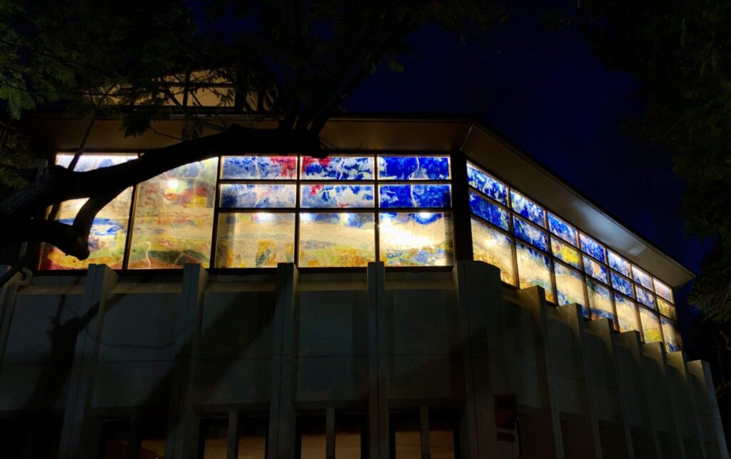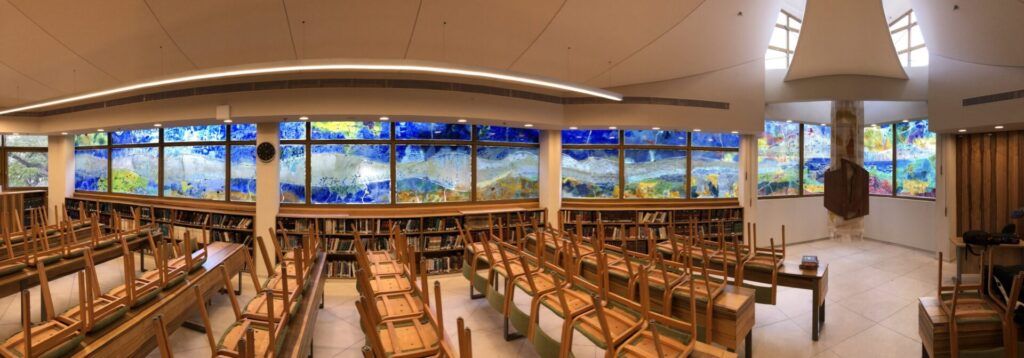 Uniquely, the Aron Kodesh is suspended from above and does not come into contact with the ground. The windows are also unique both in composition and construction. Instead of using traditional leaded joints to hold glass pieces together within a solid frame, the windows at Bar Ilan are composed of 132 distinct plates of 3-layer glass, suspended one to another by way of brass links which allow views of the outside to become part of the painted mural.