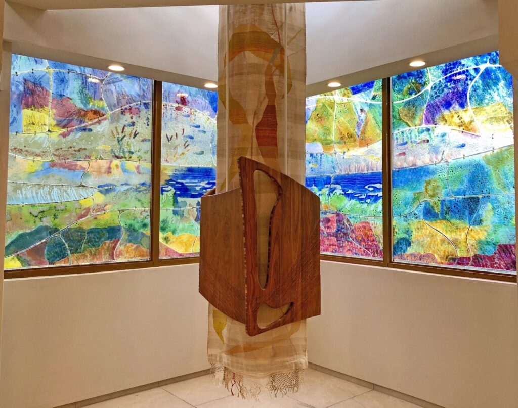 In May of 2019 Eddie Jacobs was invited by Ronnie Stern (President of the American Friends of Bar-Ilan) and Michael Jesselson (Honorary President of the American Friends of Bar-Ilan) to create a Torah Ark (Aron Kodesh) and a glass window mural spanning the entire side of the Woman’s Beit HaMidrash Building at Bar Ilan University, known as the Midrasha.