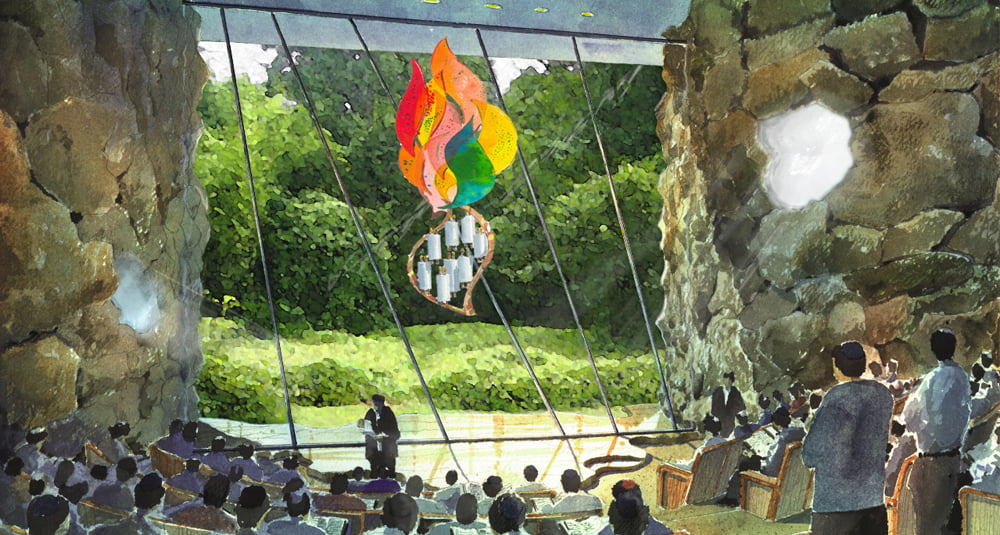 The Aron Kodesh/Ark is literally suspended from the ceiling, behind a stationary glass Parochet/Curtain composed of multitudinous glass pieces recalling the fires of creation. During the day, this apparition will glisten with natural light, and in thee evening hours will be illuminated from within.