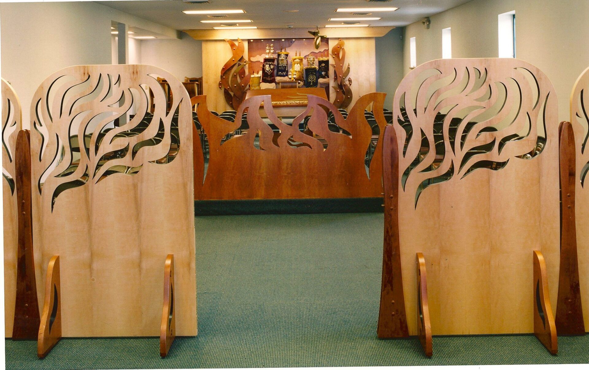 The Mechitza is composed of 6 ft. high cherry wood panels with laser cut apertures striking a balance between the desired Halachic mandates of the Rabbi and practical considerations of woman who wished to feel part of the service. The design at once evokes a classical ‘Tree of Life’ theme, but also recalls the ‘Burning Bush” of Moses’ prophecy.