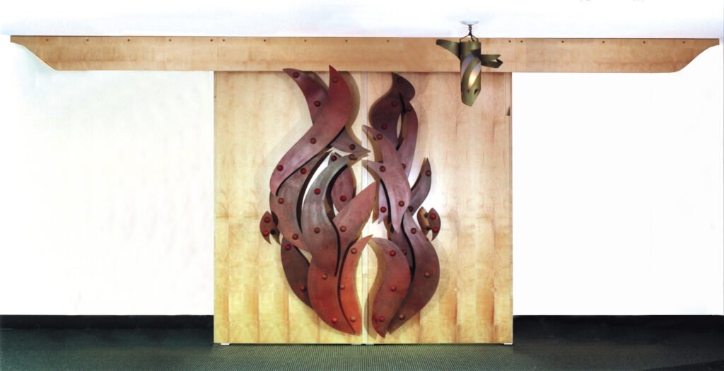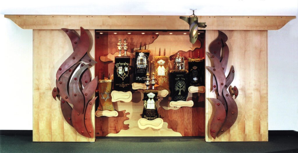 The Aron Kodesh/Ark located at the front of the room is situated on a 12 inch high platform and is clearly the central focus of the sanctuary. Decorating the 10 ft. high cherry wood doors is a ‘Pillar of Fire’ motif in bronze. The doors slide open to reveal the maple interior with its ‘Pillar of Cloud’ motif, bathed in light, supporting the Torah scrolls on individual shelves.