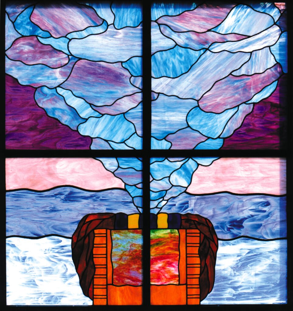 The window on the wall directly behind the women’s section contains the main stained- glass window, filling the entire sanctuary with beautiful colored light. Depicted is the “Pillar of Fire, Pillar of Cloud” composition. This window, in conjunction with the second window above the entrance door, which depicts the ‘Cloud of Glory’ above the Mishkan, create a dramatic and stunning frontispiece for the building which is back-illuminated every evening and has become a beautiful signature for both the building and the street.